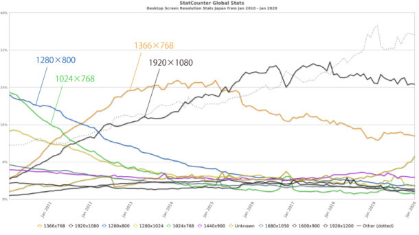 しかしこれらの解像度のシェア率はだんだんと落ちていき、2020年1月現在では国内で10%以下です。
