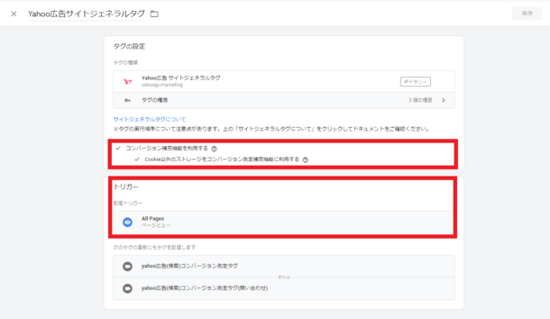 ここでは、設定タグにはYahoo広告サイトジェネラルタグを設定します。適宜必要なタグを設定します。