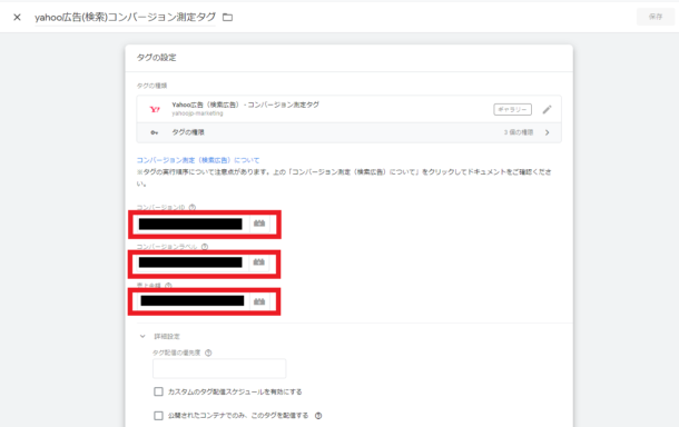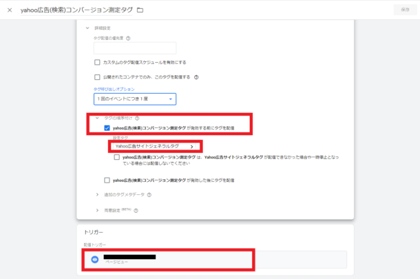タグの順序付けの項目で、yahoo広告(検索)コンバージョン測定タグ が発効する前にタグを配信にチェックを入れます。