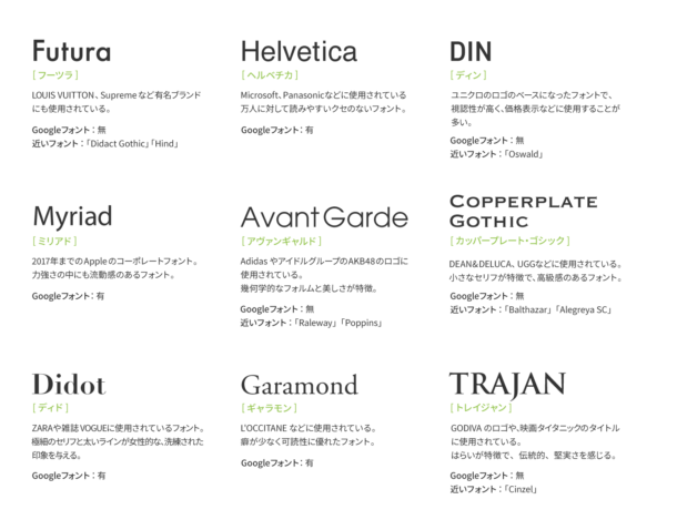 書体パターンの引き出しが少ないと感じているので、備忘録的なものとして有名なフォントをまとめました。