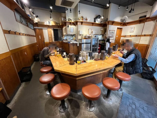 お店に入るとコの字に広がったテーブルがありました、10人くらいなら座れるみたい