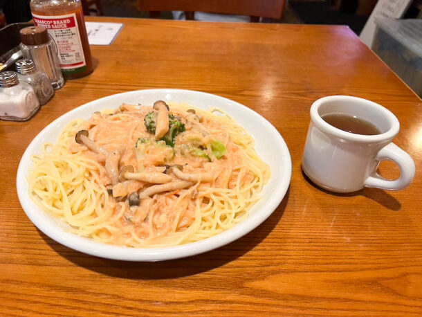 注文してすぐに熱々のスープが席に置かれ、少しだけ待つとパスタが到着!