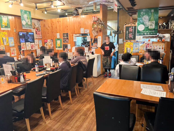 入り口から階段で地下に降りていくとお店の内観はこんな感じ、壁におすすめメニューやイラストなどが貼られており居酒屋独自の風情と温かみを感じられます。