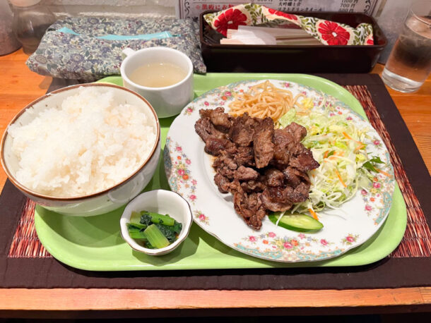 席に着席し待つこと数分で料理が到着!今回は焼肉カルビ定食のお肉を大盛りで注文!