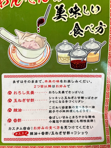 卓上には、おろし生姜・香酢・食べるラー油・甘酢漬刻み玉ねぎなど小瓶に入った調味料と案内用のメニューがあり、それらを使って味変をしながらワンタンを楽しむのがこのお店の特徴みたいです。